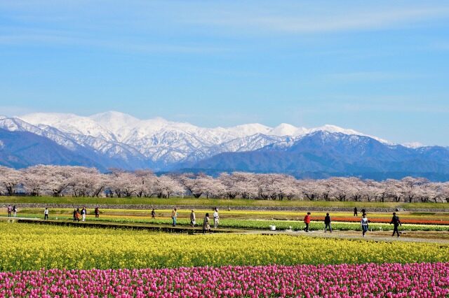 残雪の朝日岳を背景として、桜、チューリップ、菜の花が咲きそろうこの時期だけの景色