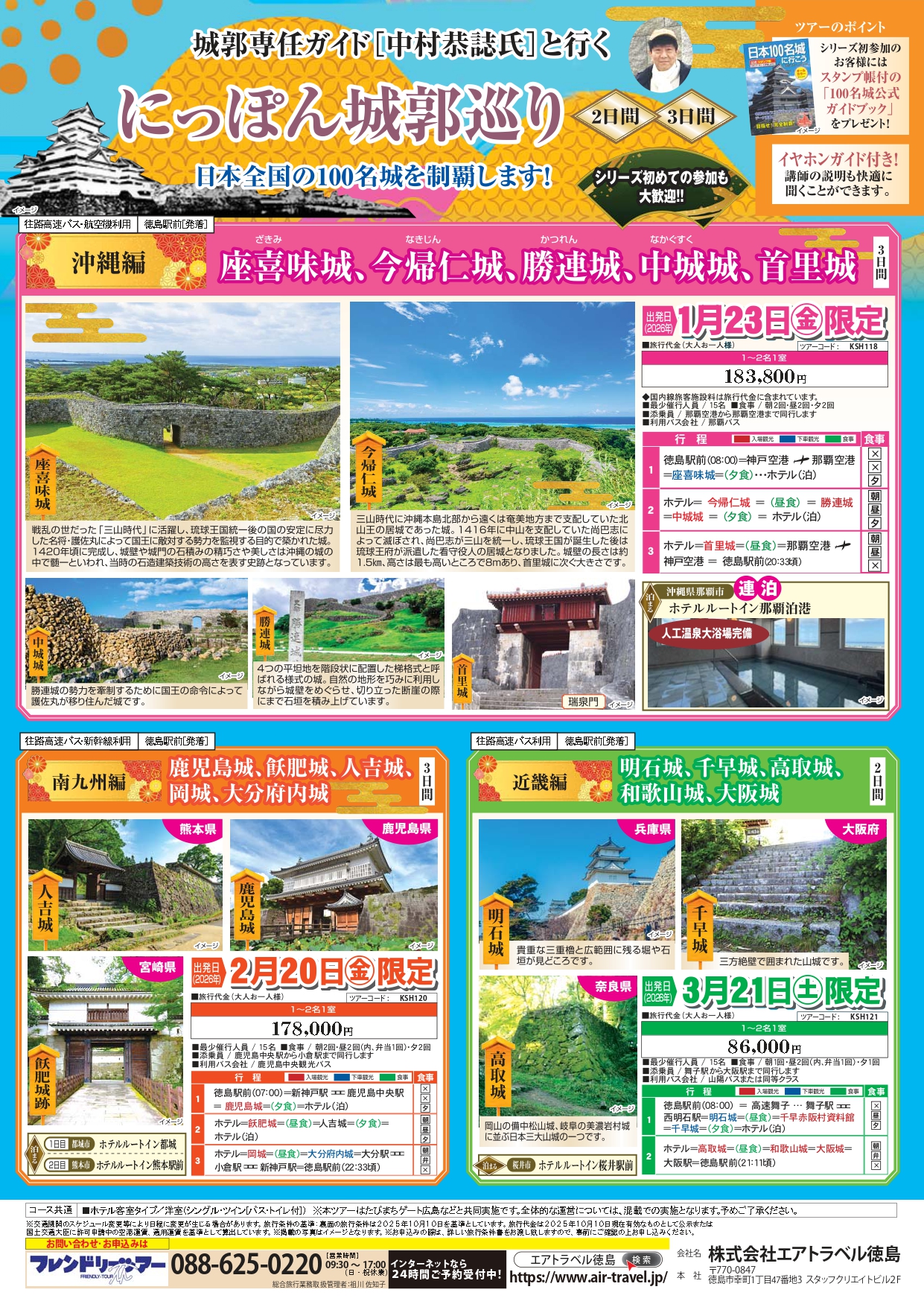 | 1 | 徳島駅前(08:00)=高速バス=高速舞子・・・・・舞子駅+++++西明石駅=○明石城=昼食=◎千早赤阪村資料館=○千早城=夕食=ホテル(泊) 〈食事〉朝×昼○夕○ ホテルルートイン桜井駅前【泊】 |