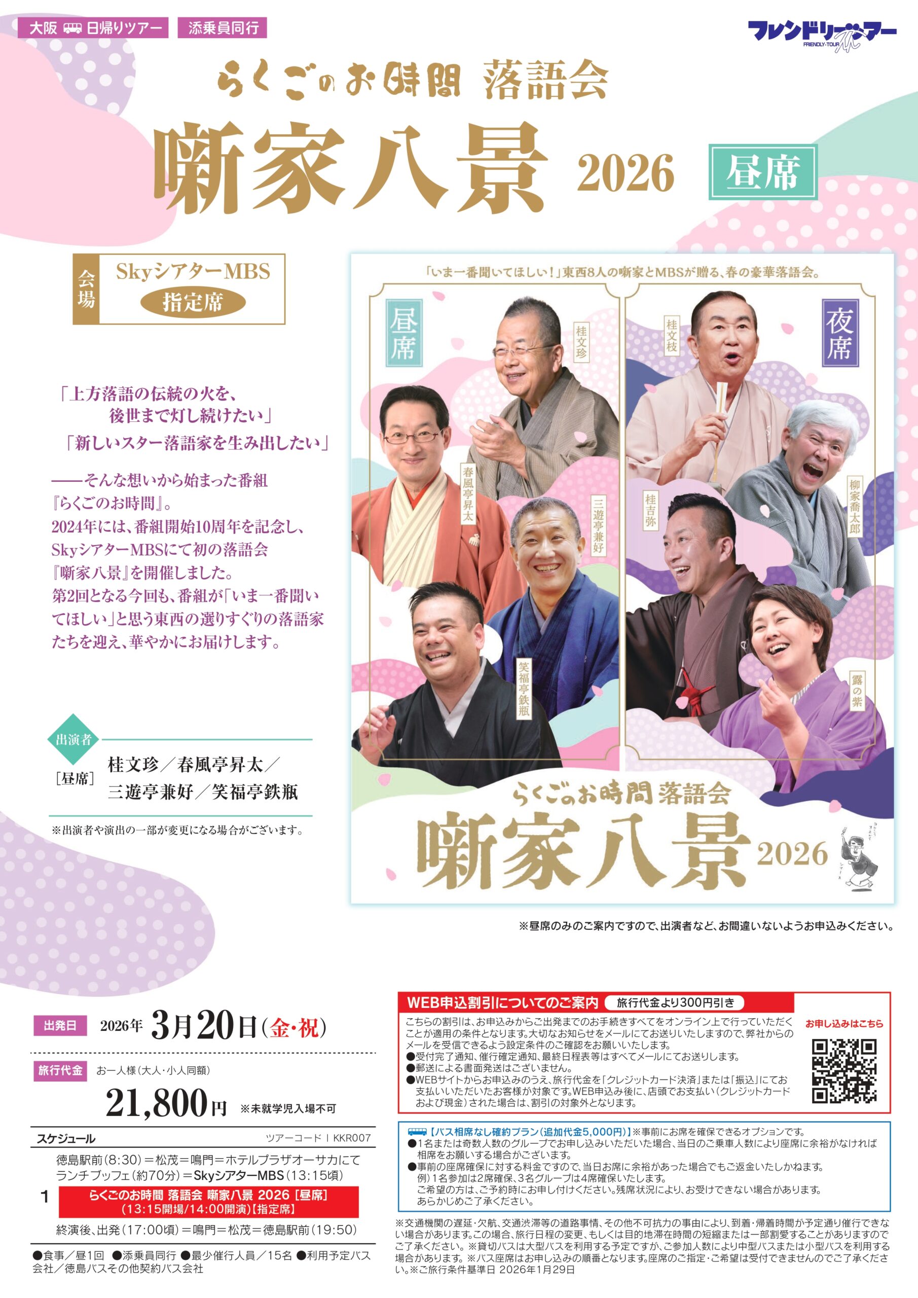 | 1 | 徳島駅前(8:30)=松茂=鳴門=ホテルプラザオーサカにてランチブッフェ(約70 分)=Sky シアターMBS(13:15 頃) らくごのお時間 落語会 噺家八景 2026 [昼席]13:15 開場/14:00 開演 指定席 終演後、出発(17:00 頃)=鳴門=松茂=徳島駅前(19:50) |