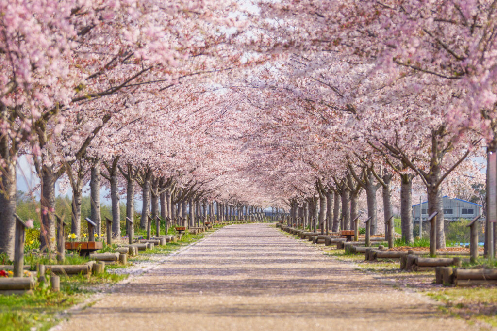 【おの桜づつみ回廊】西日本最大級ともいわれる約4km、約650本の桜の回廊。開花時期の違う5種類(江戸彼岸、大島、染井吉野、思川、八重紅枝垂)の桜が上流から下流へ順に植栽されています。