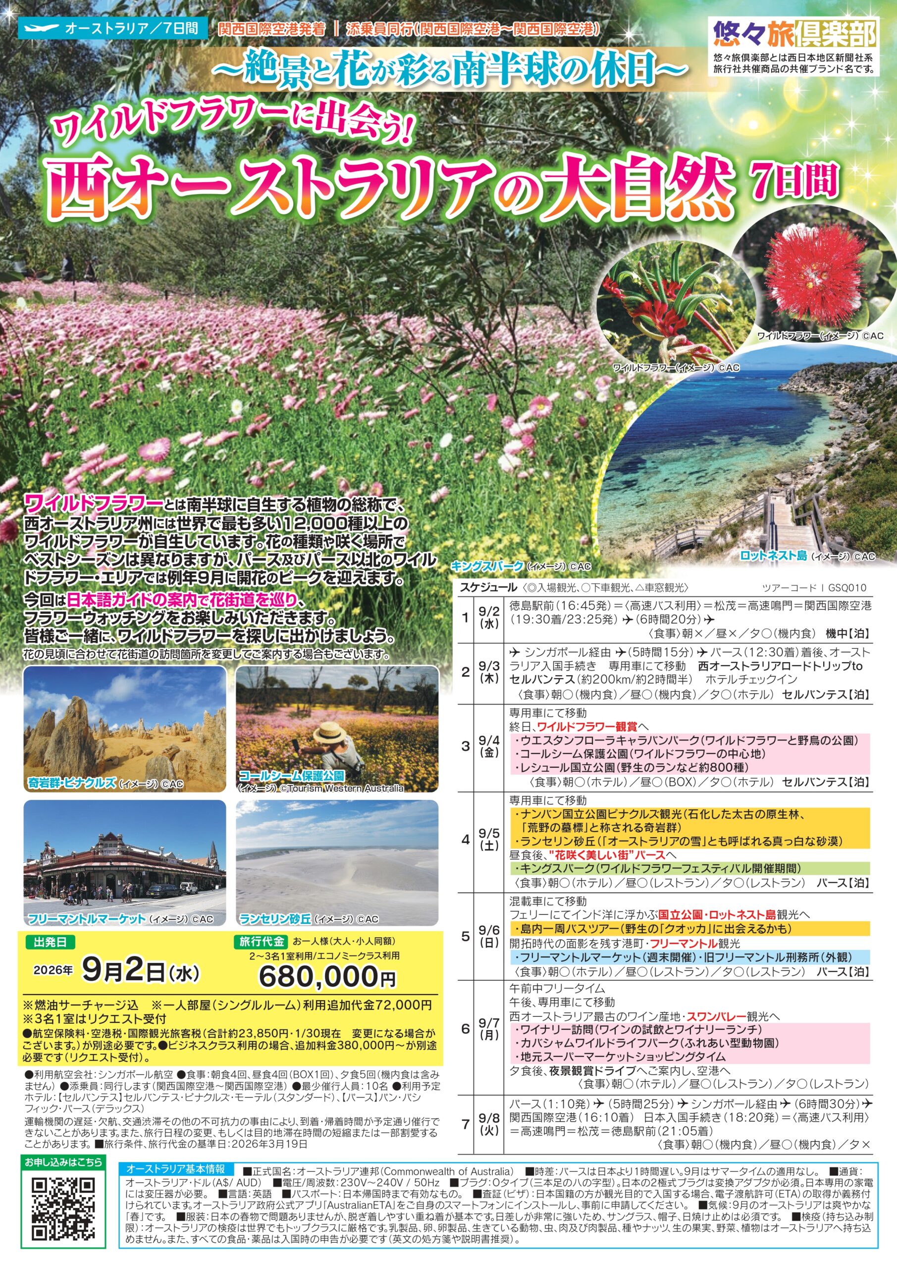 ワイルドフラワーとは南半球に自生する植物の総称で、西オーストラリア州には世界で最も多い12,000種以上のワイルドフラワーが自生しています。花の種類や咲く場所でベストシーズンは異なりますが、パース及びパース以北のワイルドフラワー・エリアでは例年9月に開花のピークを迎えます。今回は日本語ガイドの案内で花街道を巡り、フラワーウォッチングをお楽しみいただきます。皆様ご一緒に、ワイルドフラワーを探しに出かけましょう。