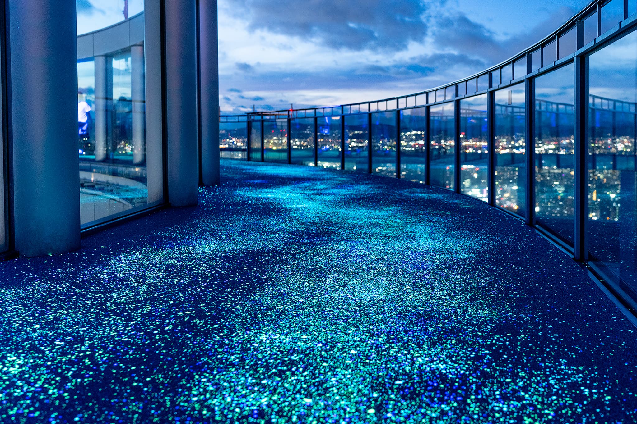 地上173m、吹き抜けの「スカイ・ウォーク」では、遮るもののない360度のパノラマビューを体感できます。夜は「日本の夜景100選」にも選ばれた宝石のような輝きを堪能できます。